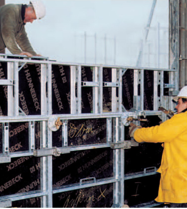 Опалубку Takko, Rasto монтируют вручную, либо – при сборке больших «карт» – с помощью крана. Универсальность ее применения на поверхностях разной площади обеспечивается общими удобными крепежными замками. Длительность службы опалубки достигается благодаря стальным оцинкованным рамам толщиной 12 см.